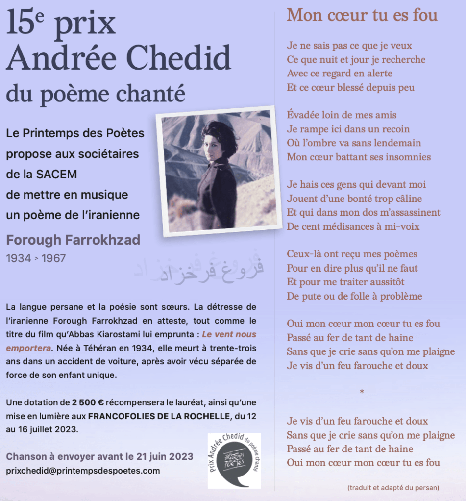 The song “Mon coeur tu es fou”, composed by Moreno Andreatta after a very inspiring text by the Iranian poetess Forough Farrokhzad (1934-1967), has successfully passed the pre-selection for the Prix Andrée Chedid! The song has been orchestrated, arranged, recorded and mixed by the talented musician Benoît Messinger and wonderfully interpreted by the singer and songwriter Menoosha. Thank you both for their excellent work!